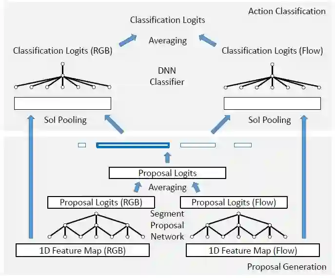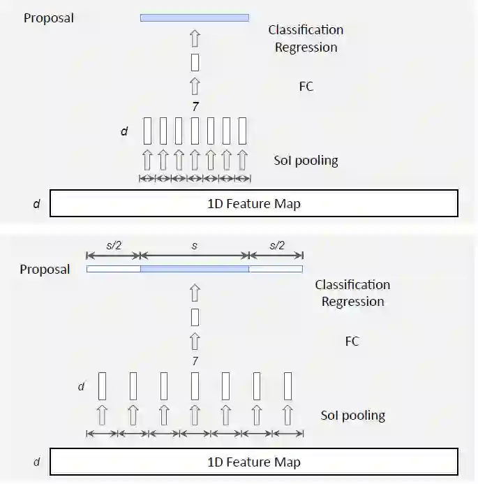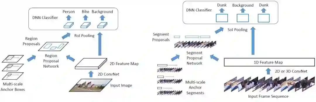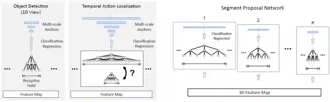 Faster R-CNN 很自然地被拓展到时序动作定位领域 [15, 9, 51]。回想一下,目标检测的目的是检测二维空间区域。而在时序动作定位中,目标则是检测一维的时序片段,每个片段都以一个开始时间和一个结束时间来表示。时序动作定位因此可以被看作是目标检测的一维版本。图 1(右)展示了一个典型的 Faster RCNN 时序动作定位流程。与目标检测类似,它包含两个阶段。首先,给定一组帧序列,我们通常通过二维或者三维卷积网络提取出一个一维特征图。之后,将该特征图传输给一维卷积网络(指候选片段网络,Segment Proposal Network),在每个时间点上对一组大小不同的 anchor 片段进行分类,并且对边界进行回归。这将返回一组稀疏的类别无关的候选片段。接着,对于每个候选片段,我们计算动作类别的概率,并进一步对片段边界进行回归(修正)。在这一步,首先使用一维的 RoI 池化层(也称「SoI 池化」),接着使用 DNN 分类器来实现。