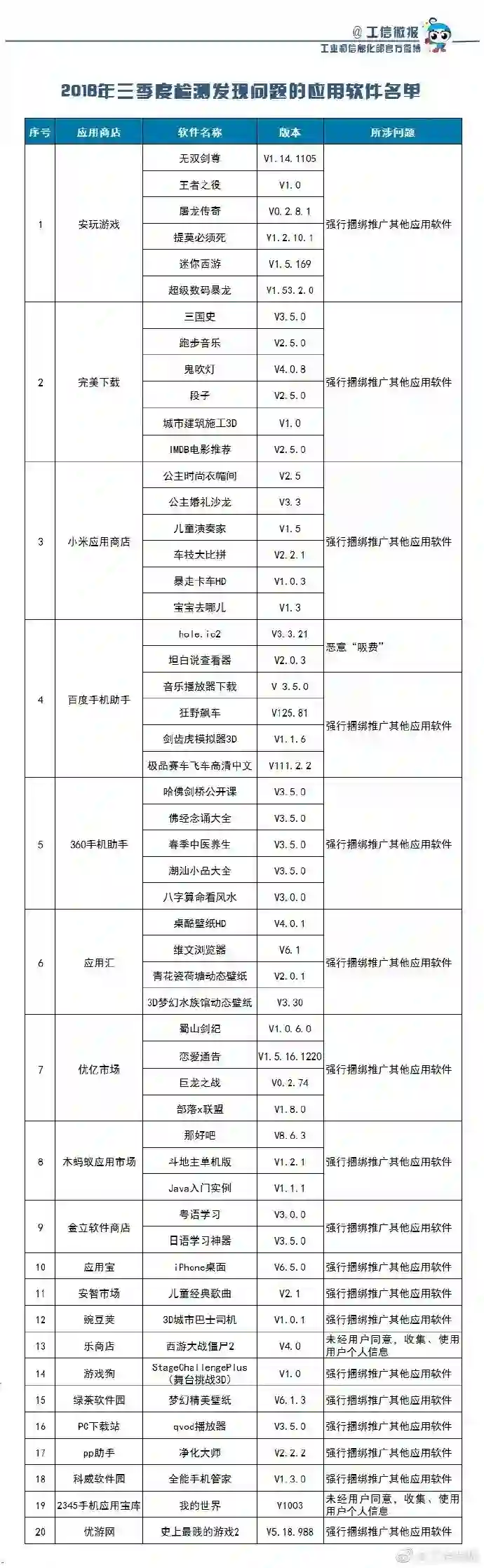 本次通报的问题 App 名单如下,图片来自工信部官方微博@工信微报。