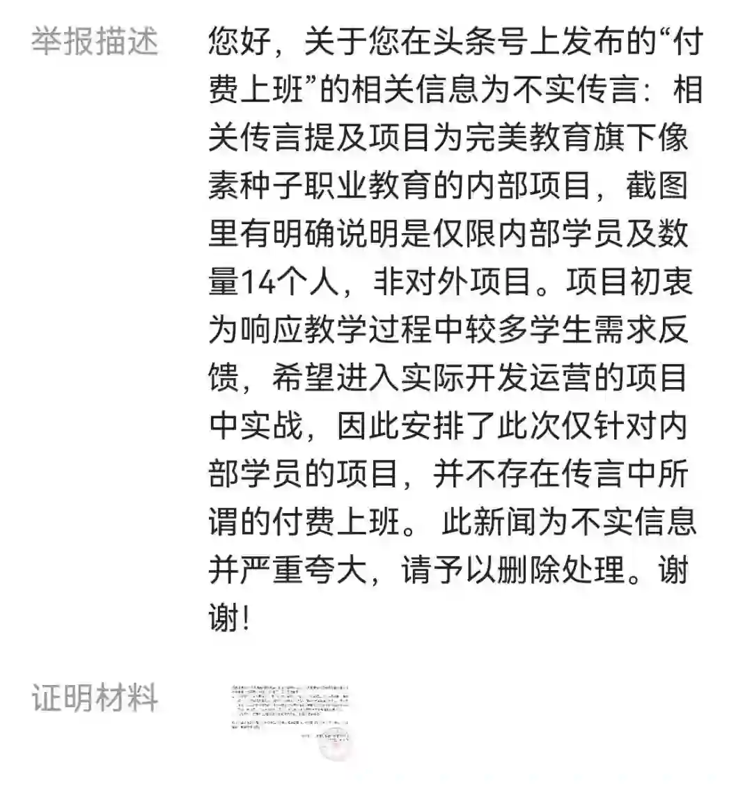 随着事情的不断发酵,完美世界相关人士表示,该项目是完美世界教育旗下像素种子职业教育的内部项目,仅收内部学员14名,而不是对外项目,并非网传的“找人付费上班”。而且这个项目是由于在教学过程中,收到较多同学的反馈,学员想进入实际开发运营的项目中实战,所以安排了这次给内部学员试验项目。