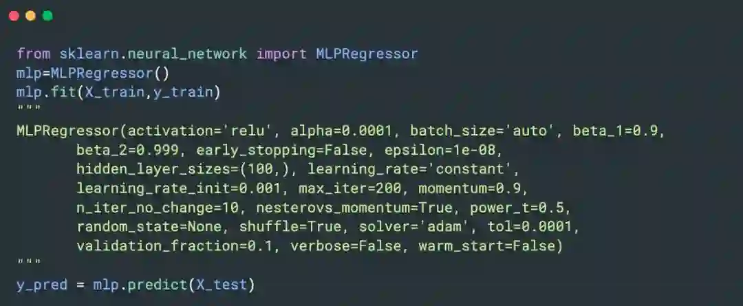 神经网络使用 slearn 中 MLPRegressor 类实现了一个多层感知器(MLP),它使用在输出层中没有激活函数的反向传播进行训练,也可以将衡等函数视为激活函数。