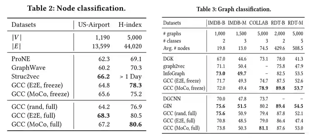 下游任务主要分为图级别的和节点级别的任务:图级别的任务直接用GIN的输出作为图的表示,节点级别的任务利用GIN对r-ego网络的编码作为中心节点的表示。依据是否在微调过程中训练GIN,本文又分了Freezing和full fine-tuning模式。作为一种关注节点局部的算法,GCC能扩展到大规模数据集以及分布式计算上。