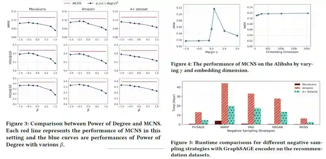 上述三个实验分别对比了本文方法和基于度的采样策略的方法、不同采样策略的所用时间以及铰链损失的参数 和表示维度对结果的影响。