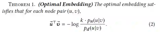 上式中, 代表目标节点, 代表正样本, 代表负样本,相应地 代表正样本分布, 代表负样本分布,k是需要采集的负样本数, 代表sigmoid激活。针对上述的目标函数,本文通过理论证明最优的节点表示应该如下所示: