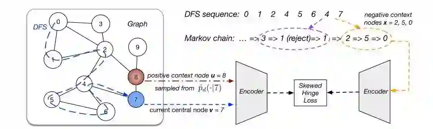 然而由于分母的存在导致对于每个节点来说复杂度都是O(n),效率低下。针对这个问题,Metropolis-Hastings算法通过从提议分布中采样样本,并按照设定的概率接受或拒绝,从而形成了一个样本序列。该序列中的每个样本只和上一时刻的样本有关,因此可构建成马尔科夫链。当样本序列接近无穷时,采样得到的样本就近乎是从真实分布中得到的样本。在此基础上,本文结合了图中固有的局部平滑的特点,进一步加速了该算法:用深度优先算法遍历图中节点,得到相邻节点有边的序列,由于邻居节点间的负样本分布近似相同,因此沿遍历到的序列进行训练时,马尔科夫链可以不断开。具体流程如下图所示(图中对于每个节点采集三个负样本):