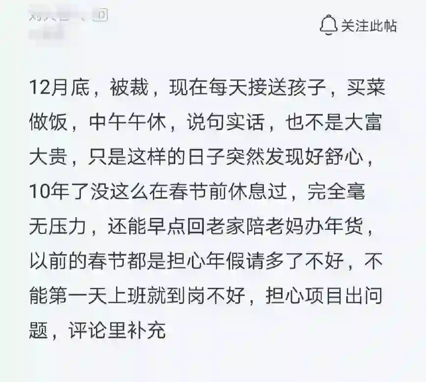 一名程序员在年前被裁员了,也许是塞翁失马,焉知祸福,借着这段被裁员的日子,这名程序员索性开始放松享受生活:12月底被裁,现在每天接送孩子买菜做饭,中午午休,说句实话也不是大富大贵,只是这样的日子突然发现好舒心,十年了没这么在春节前休息过,完全毫无压力,还能早点回老家陪老妈办年货,以前的春节都是担心年假请多了不好,不能第一天上班就到岗不好,担心项目出问题。