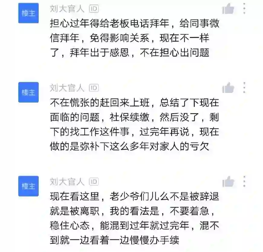 担心过年得给老板电话拜年,给同事微信拜年,免得影响关系,现在不一样了,拜年出于感恩,不在担心出问题,不在慌张的赶回来上班,总结了下现在面临的问题,社保续缴,然后没了,剩下的找工作这件事,过完年再说,现在做的是弥补下这么多年对家人的亏欠。现在看这里,老少爷们儿么不是被辞退就是被离职,我的看法是,不要着急,稳住心态,能混到过年就过完年,混不到就一边看着一边慢慢办手续,该自己的就是自己的,一分不让,加班,年假,年终,全部可以争取,不要怕仲裁,大不了跟我一样赋闲在家。