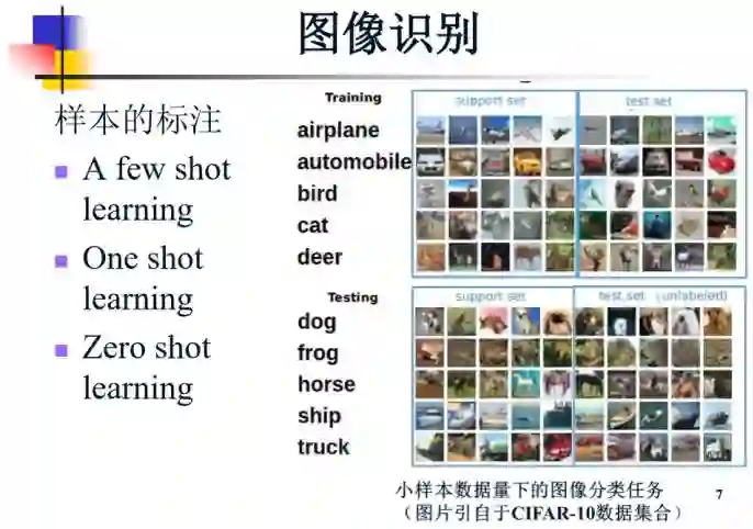 当数据没有那么多的时候,怎么办?机器学习界遇到了这样的问题,就是小样本的数据学习。当样本不多的时候能不能达到和大数据量类似的识别效果?例如上图中只有几张狗的图片的时候,要识别狗,还能从哪里得到狗的信息?思路是从其他的图片中来,比如上边有有鸟,有猫,有鹿,它们的皮毛很像狗等等。换句话说,他从其他的丰富的图像中获取一些信息,把那些信息迁移到这个少量的数据上,从而能够实现对狗的识别。