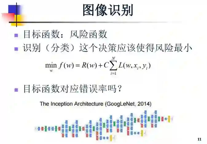 我们再说风险,图像识别中我们会把一个学习问题往往形式化一个优化问题,然后去优化这个函数,使这个函数最小。我们把这个函数叫做目标函数。有的时候我们会把这样的函数叫做损失函数,物体识别有错就带来损失。就是说在整个过程我们希望不要有太多的损失。其实,风险函数可能是更合适的词。因为你识别错了,其实是有风险的。一般来说目标函数对应于错误率,把狗识别成猫错了一张,把猫识别成狗又错了一张,都影响错误率,而错误率足以反映算法的性能。