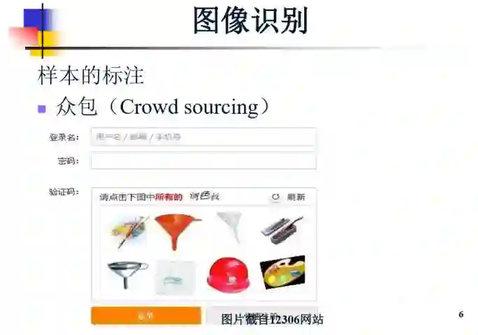 我们现在的图像识别方法是基于标注的数据的,这叫做监督学习。图像标注就意味着把图像一张一张抠出来。如果我们开车穿梭在北京市大街小巷,但是交通标志并不是在视频的每一张图片上出现。如果我们需要把视频中交通标志如果都要标出来,需要花很多钱。做机器学习的人会关心我们能不能通过一些其他更廉价的方法去做数据标注,例如能不能通过一些众包的方式去做。在12306网站购买火车票,每次让我们勾出相对应的图像,这可以看做是在标注数据。但是众包标注数据也存在一些问题,就是每个人标的时候会不一样,有时会有错误。所以在机器学习中,有人关心在众包情况下、标注数据有错的时候,我们如何设计学习算法,使得它对错误的标注不敏感。这个事大概七八年前就开始研究,不断的有新的文章出现。