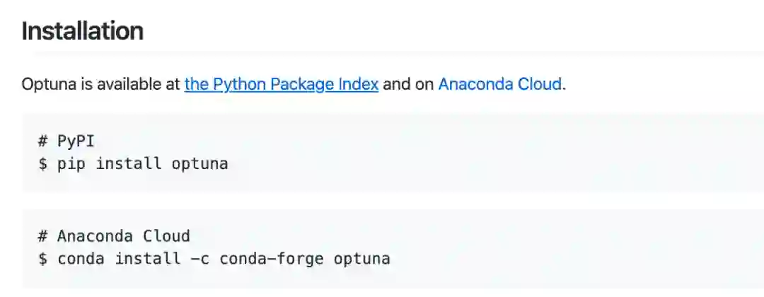 Optuna可以通过 pip 或 conda 指令进行安装,目前支持 python3.5 以上的版本,更多相关资料详见官网,官方文档,以及 Github 主页。