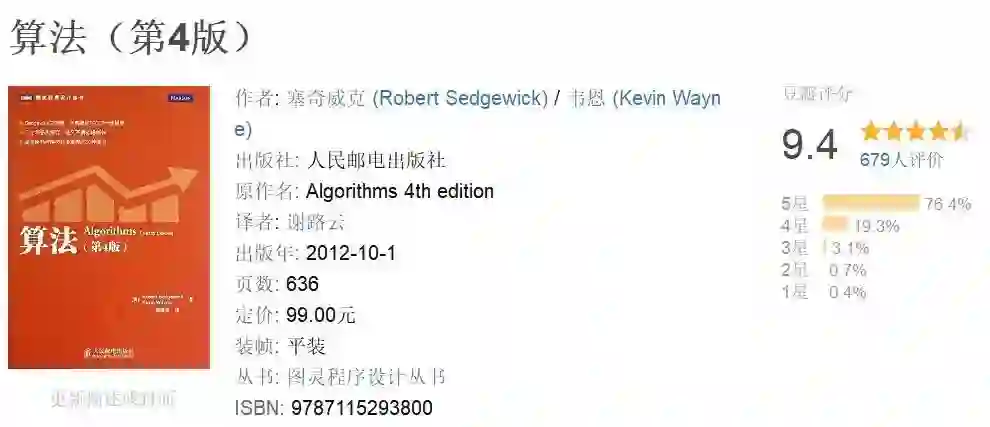 如果《图解算法》对于你来说太简单了,那么你可以选择这本《算法(第4版)》,本书涵盖所有程序员必须掌握的50种算法,全面介绍了关于算法和数据结构的必备知识。