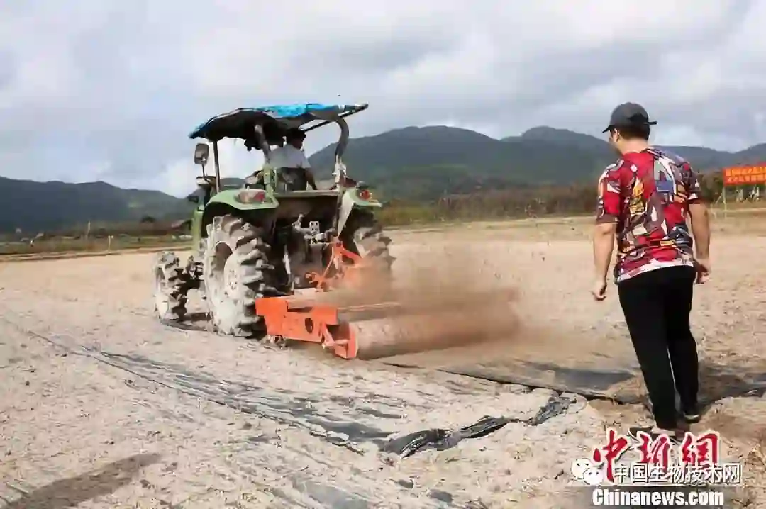 中新网三亚1月10日电 (记者 王晓斌)眼下中国大部分地区正是冬季农闲时节,地处热带的三亚迎来新一轮水稻播种期。1月10日,三亚水稻国家公园的南繁基地内,国家杂交水稻工程技术研究中心、国家南繁基地、海南省农科院稻作研究所、湖南省农业科学院生物技术研究所和黑龙江百顺源现代农业集团袁隆平院士工作站等单位联合在此进行水稻机械化覆膜种植试验。技术人员通过覆膜直播的方法,种下袁隆平团队研发的“超优千号”稻种。