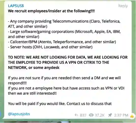 Lapsus$ 通过 Telegram 频道招募企业内部员工。