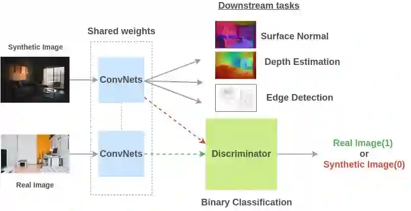 为了解决这个预备任务,任等人提出一个架构,使用共享权值的卷积网络在合成和真实图像上进行训练,然后鉴别器学会分类合成图像是否是一个真正的图像。由于对抗性,真实图像和合成图像之间的共享表示变得更好。