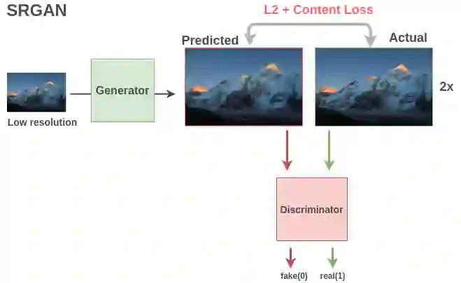 基于GAN的模型如SRGAN在此任务中很受欢迎。生成器获取低分辨率图像并使用全卷积网络输出高分辨率图像。使用均方误差和内容损失来模拟类人质量比较,对实际生成的图像和生成的图像进行比较。二进制分类鉴别器获取图像并对其进行分类,判断它是实际的高分辨率图像(1)还是假生成的超分辨率图像(0)。这两个模型之间的相互作用导致生成器学习生成具有精细细节的图像。