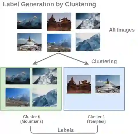 为了解决这个预备任务,Caron et al.提出了一种称为深度聚类的架构。在这里,首先对图像进行聚类,把聚类出的类别用作分类的类别。卷积神经网络的任务是预测输入图像的聚类标签。