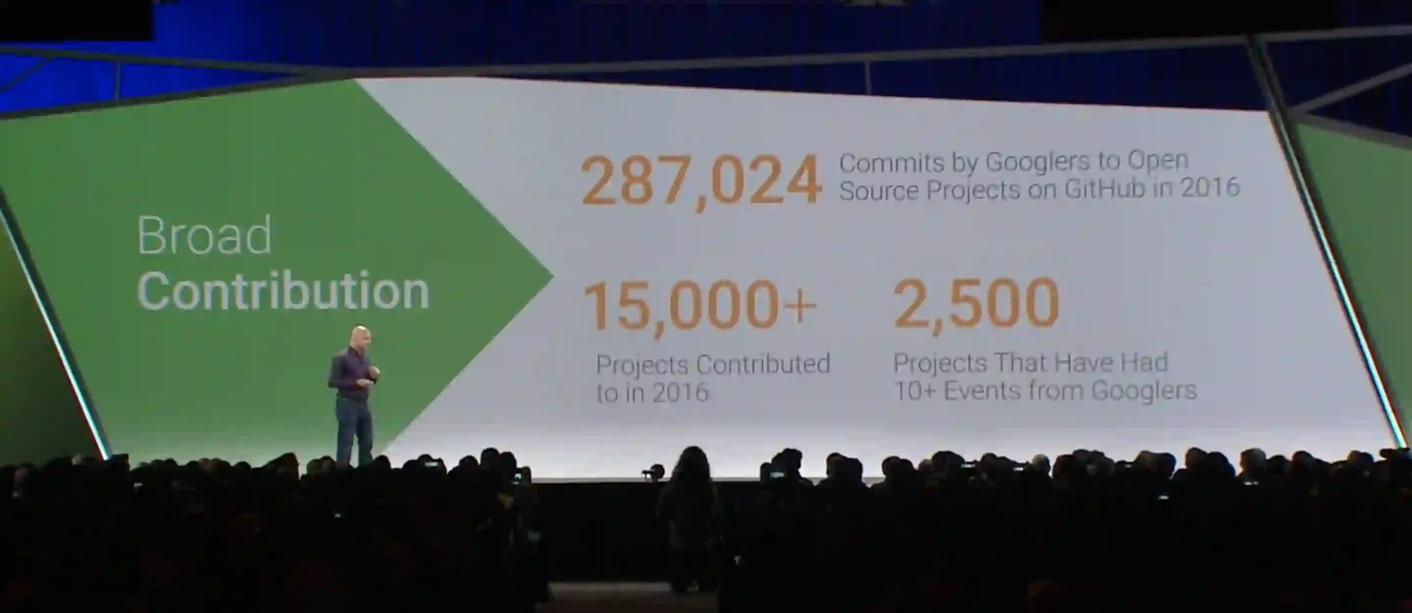 他用数据说明了谷歌去年对开源社区所做出的贡献:在 2016 年,由谷歌人在 GitHub 上 commit 过的开源项目就超过了 28 万个(这只是使用 @google.com 邮箱的提交,更不要说还有使用 Gmail 等个人邮箱的提交),贡献的项目超过 1.5 万个,谷歌人贡献出的超过 10 个 Events 的项目有 2500 个。