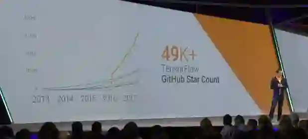 Jeff Dean 介绍说 TensorFlow 的目标是建立一个共同平台,使其成为世界上最好的开源平台。但为什么要开源呢?Jeff 说谷歌开源 TensorFlow 的目的是为了构建一个共享研究的公共平台以及将机器学习带给每一个人。如同 Jeff 在首届 TensorFlow 开发者大会上介绍的那样,短短一年的开源 TensorFlow 已经成为了 GitHub 上最受欢迎的机器学习项目,有着 4.9 万以上的 star 量。