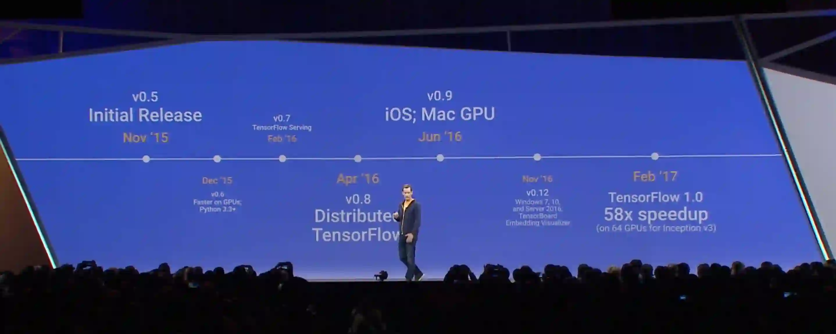2 月份,谷歌刚刚发布 TensorFlow 的 1.0 版本。从 2015 年底的最初开源到 1.0 版本的发布,他们对 TensorFlow 做出了大大小小的修改与性能添加。Jeff 还重点说到,TensorFlow 另一重要的特性就是支持多种平台:CPU、GPU、TPU、安卓、iOS、树莓派等。