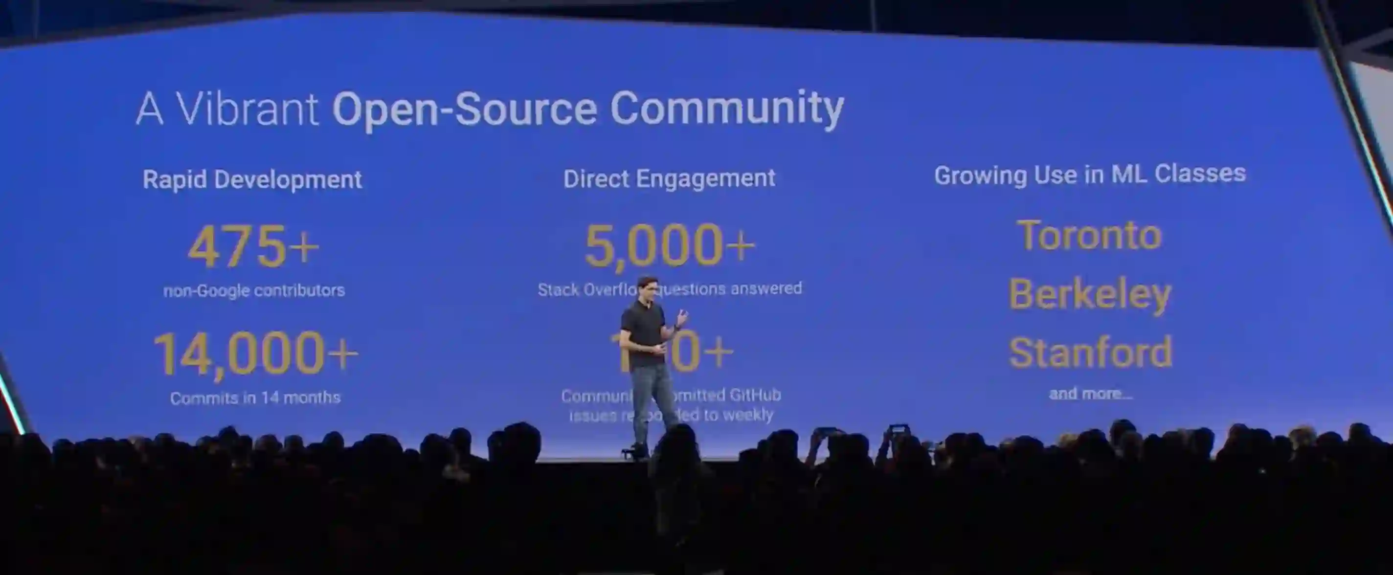 在 Jeff Dean 大致介绍了 TensorFlow 的开源状况之后,TensorFlow 的另一负责人 Rigat Monga 也分享了他对开源的认识,他认为对任何开源项目而言最重要的就是社区。而谷歌正有着强大的开源社区。