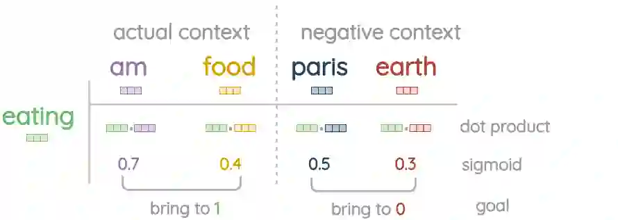4、我们在中心词和实际上下文词之间取点积,并应用sigmoid函数来得到0到1之间的匹配分数。