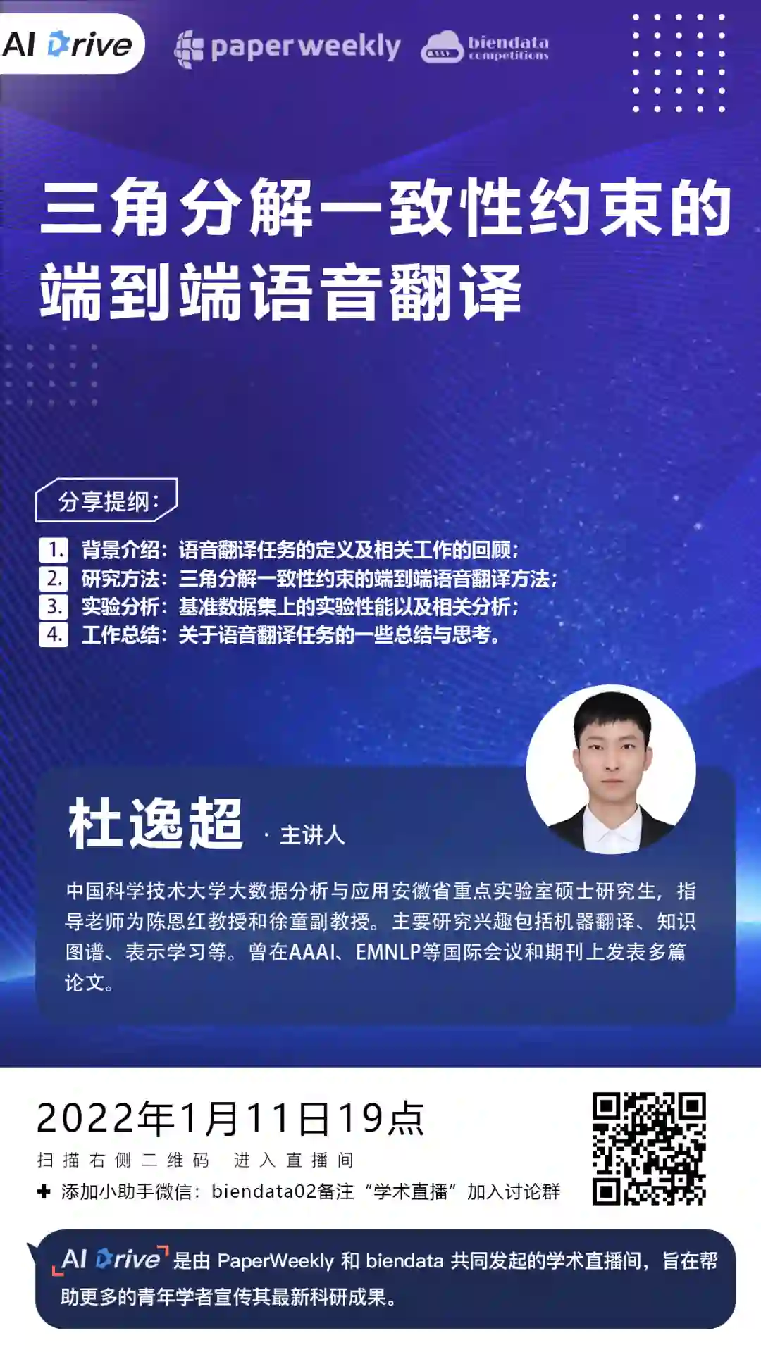 本期 AI Drive,我们邀请到中国科学技术大学硕士生杜逸超,为大家在线解读其发表在 AAAI 2022 的最新研究成果:Regularizing End-to-End Speech Translation with Triangular Decomposition Agreement。对本期主题感兴趣的小伙伴,1 月 11 日(本周二)晚 7 点,我们准时相约 PaperWeekly 直播间。
