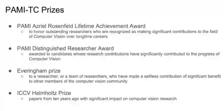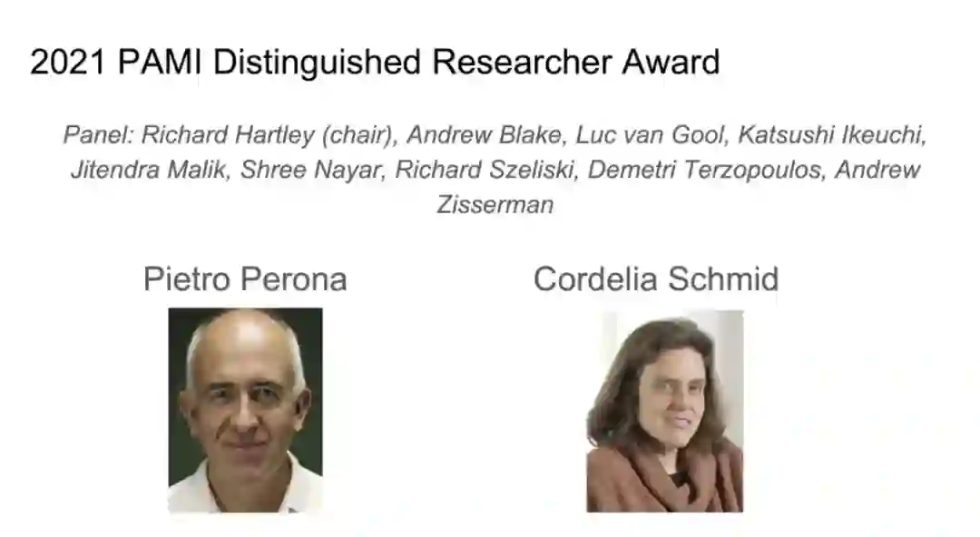 和往年一样,ICCV 21 还颁布了过往杰出研究类奖项 PAMI-TC 奖,其中包括4个奖项:Azriel Rosenfeld终身成就奖、杰出学者奖,Everingham 奖和ICCV Helmholtz 奖。