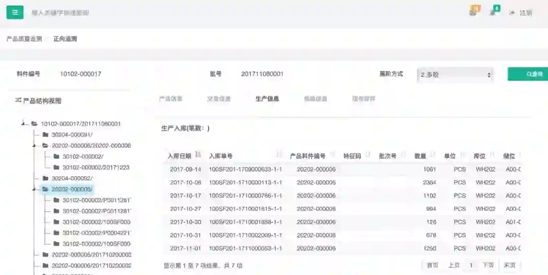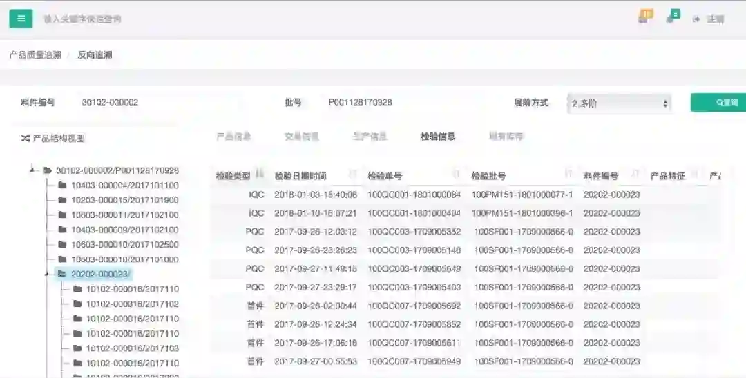 依产品所用部件或原料及批次号自下而上追溯,追溯所有用到此批次部件或原料的产品及批次、涉及到的各料件批次号的基本信息、生产过程、库存交易出入库、检验信息、现有库存信息等。