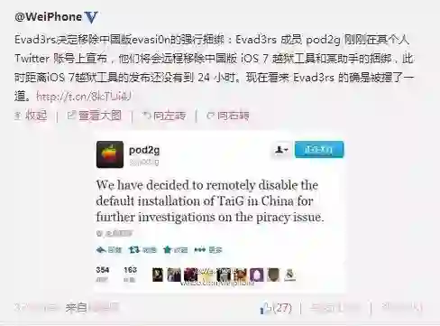 在这件事情被曝光之后,evad3rs 发出公开信,称自己并不知道太极助手有盗版行为,之前他们认为这是一款对中国用户有利的软件,所以接受了太极助手发出的合作请求。他们表示,如果太极助手有盗版行为,他们将会剔除太极助手。果不其然,在 1.0.1 版本,evasi0n 7 就移除了太极助手。