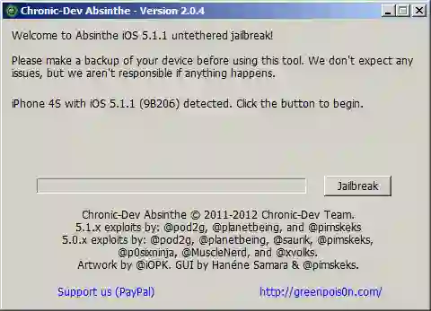 Absinthe 越狱由 Chronic Dev Team 和 iPhone Dev Team 合作开发,这就是为什么这次成果会被称为「梦之队」,其中 Chronic Dev Team 负责了越狱的 GUI 版,iPhone Dev Team 负责了越狱的命令行工具。