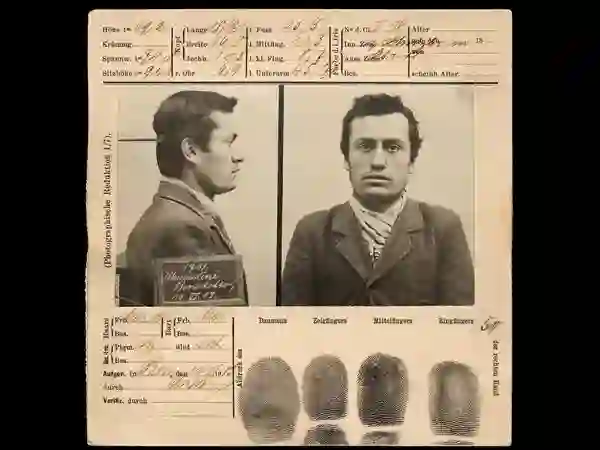 1903年,年轻的意大利独裁者墨索里尼(Benito Mussolini)因为在瑞士伯尔尼从事政治活动而被驱逐出境。在这张照片中,我们可以看到指纹、外貌特征同样出现在入案卡片中。