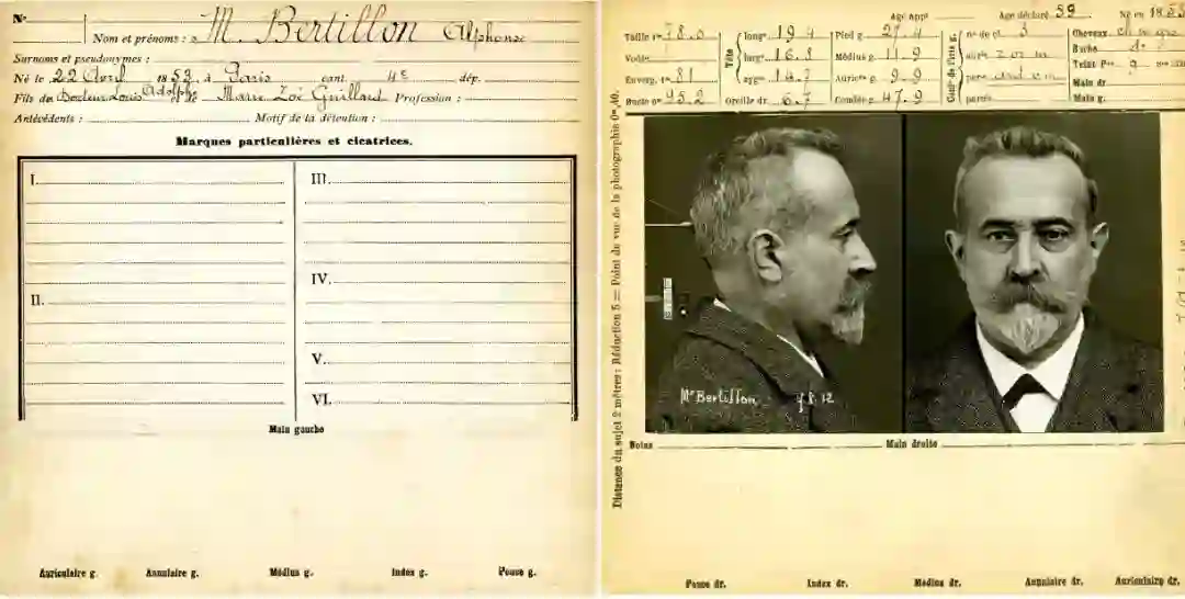 自学成才的 Bertillon 和其他警察的关注点不同,他会细致地测量疑犯的各种身体尺寸,从眉毛、眼睛、鼻子的长度到耳朵的形状,并以摄影卡片统合。人体测量学从此成为了侦破案件的一个重要突破口。