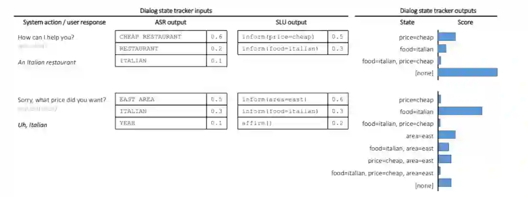 是历史的对话状态分布, 是更新后的对话状态, 是ASR/NLU是通过识别用户的话得出的状态, 是在给定的对话状态 和系统动作 下的采取的动作, 是在给定状态 和系统动作 下状态转变成 的概率, 是一个归一化的常量。这个公式定义了状态 是转移到 的概率。其中真实对话状态 和真实用户动作 被视为未观察到的随机变量,等式第一个求和项叫作观测模型,第二个求和项叫作转移模型。