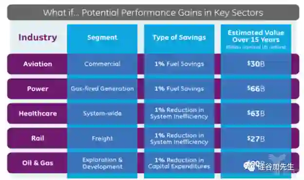 2012年,GE发布首份工业互联网白皮书,定义了工业互联网的核心要素:借数字化之手,链接工业生产最核心的设备、人与数据。在这份堪称工业互联网开山之作的白皮书中,GE提出了“the Power of 1%”的概念,阐述15年内减少任何一个核心行业1%损耗在全球工业带来的价值:航天领域300亿美金、能源天然气660亿美金、医疗健康中系统支持630亿美金……