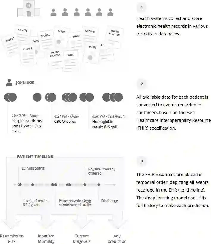 图1:来自每个卫生系统的数据,一个合适的 FHIR 资源,并按时间顺序排列。深度学习模型可以在做出预测之前使用所有可用的数据。因此,不管任务如何,每个预测都使用相同的数据。