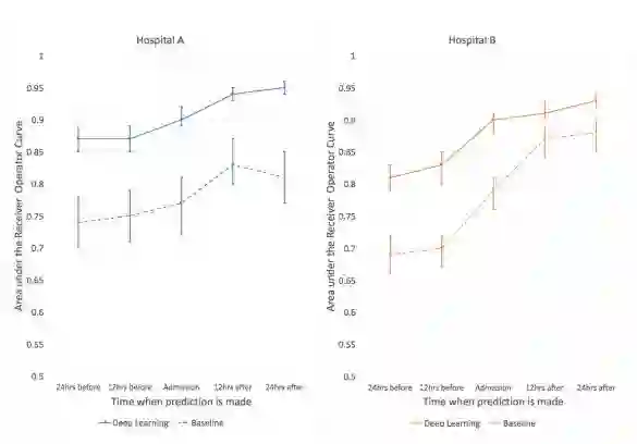 其次,基于两家具有普通患者群体(不局限于 ICU)的医院数据,展示了在各种预测问题和设置中使用深度学习模型的有效性。
