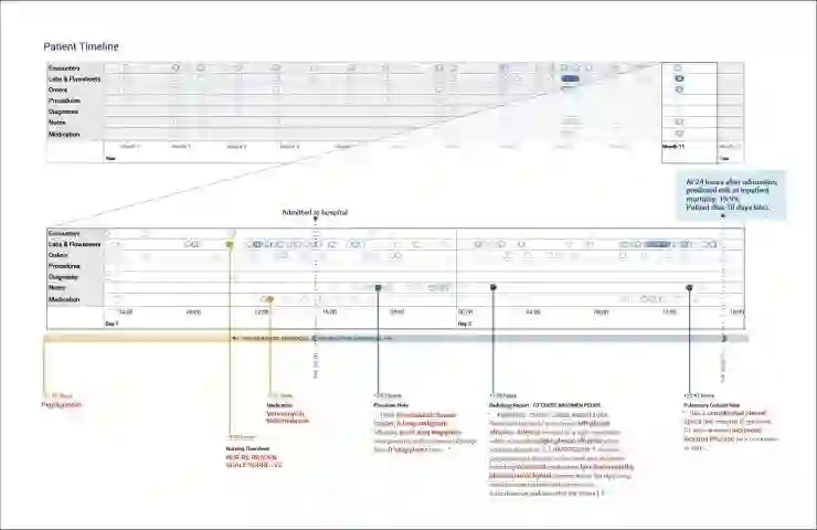 图4:患者记录显示一名患有恶性胸腔积液和脓胸的转移性乳腺癌患者。在图的顶部的病人时间线包含了每个时间步骤的圆圈,其中至少有一个标记为病人而存在,而水平线显示的是数据类型。我们训练了每种数据类型的模型,并在红色中突出显示了模型所关注的标记——非突出显示的文本没有被处理,而是显示在上下文环境中。这些模型在药物、护理流程和临床记录中提取特征来进行预测。