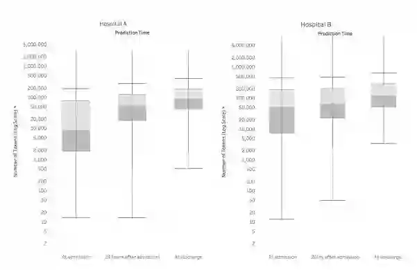 图2:箱线图显示了 EHR 中的数据量,以及它在接收过程中的时间变化。我们将一个令牌定义为电子健康记录中的单个数据元素,如药物名称,在特定时间点。每个令牌都被认为是深度学习模型的潜在预测因子。箱线图中的线表示中位数,方框表示四分位范围(IQR),须为 IQR 的 1.5 倍。令牌数量稳步增加,从入院到出院。出院时,A医院的代币数中位数为 86477,医院 B 为 122961。