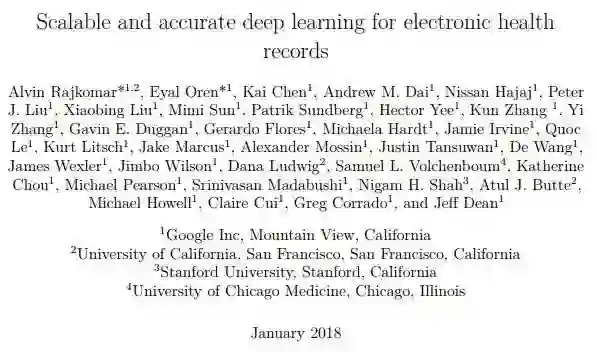 AI 科技评论消息,谷歌在 ArXiv 上公开了一篇论文,也很可能是谷歌使用深度学习模型在电子病历建模分析方面的首篇文章。这篇论文由「编译器从不警告Jeff,Jeff 会警告编译器」的谷歌大脑高级研究员 Jeff Dean 率队,联合了 UCSF、Stanford、UChicago 等知名机构的众多大牛。