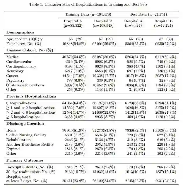 AI 科技评论了解到,作者从 2012-2016 年的加州大学旧金山分校(UCSF)以及 2009-2016 年的芝加哥大学医学(UCM)中获取了 EHR 数据。他们把每个卫生系统称为 A 医院和 B 医院。所有电子健康记录都进行了脱敏。这两个数据集都包含患者人口统计数据、诊断记录、药物治疗、生命体征等数据。UCM 数据集(但不是 UCSF)还包含了不确定的、免费的医学注释。