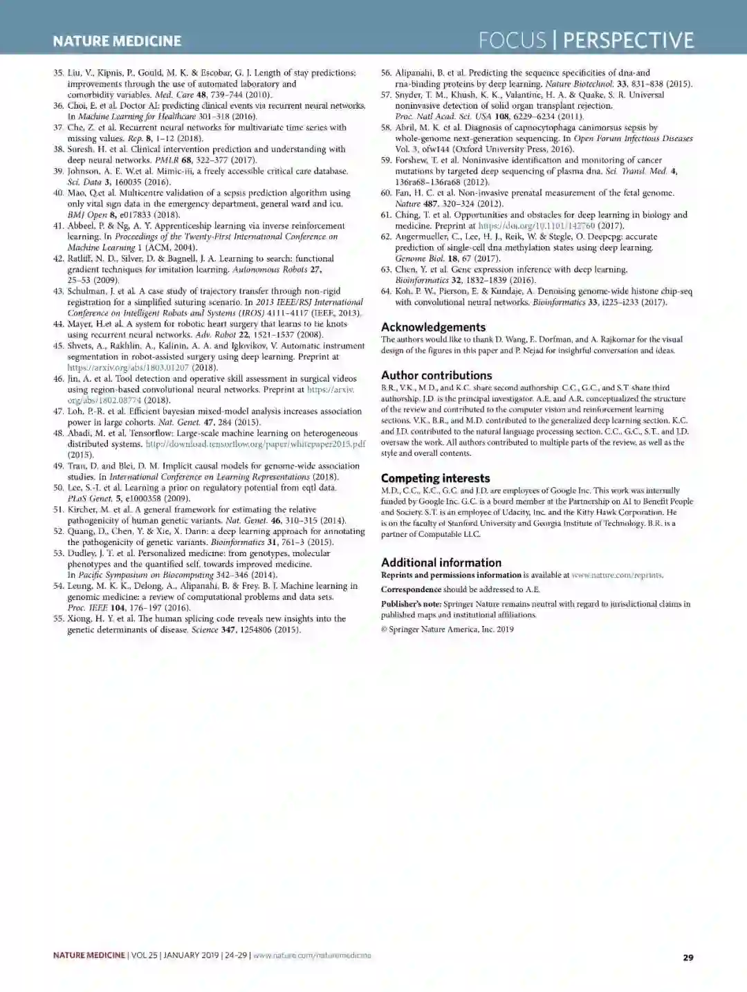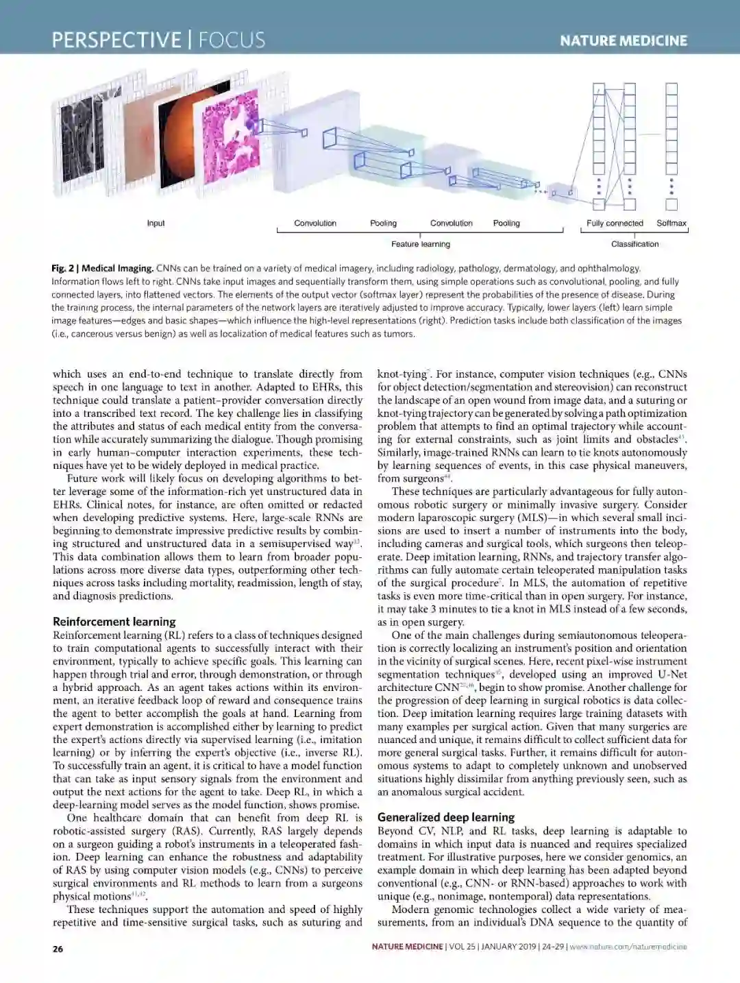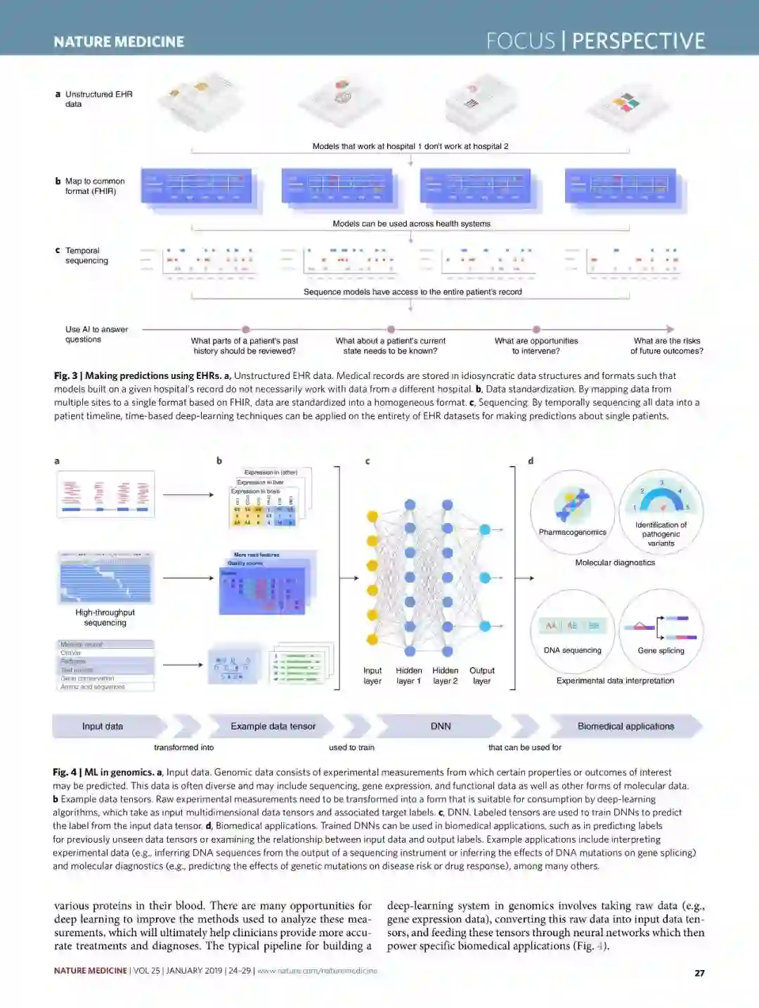 本篇文章介绍了深度学习技术对于健康领域的发展影响,并分别讨论了计算机视觉、自然语言处理、强化学习和广义方法几个方面。我们描述了这些计算技术如何对医疗领域中的关键问题产生影响,并且展示了如何构建端到端的系统。例如:计算机视觉技术应用于医疗影像处理;自然语言处理应用于电子健康信息;强化学习应用于机器人辅助的外科手术过程;广义深度学习技术用于基因领域。