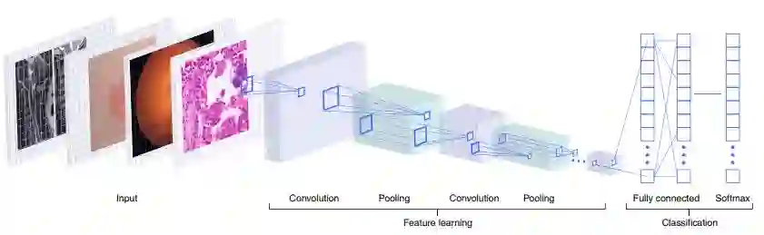 图:医疗影像中,CNNs可以在大量的医疗影像上进行训练,包括眼科、皮肤科、放射科等信息。CNN获取输入图像,并逐步对其进行变换,其中可能使用到卷积、池化、全连接层等算法。输出元素表示了各个类别可能的概率。