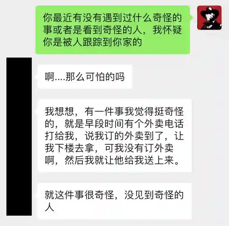 我的猜测是跟踪狂刚开始也跟我一样知道小菲住在这栋楼里,但具体不知道在几层哪间房,所以给她订了个外卖,靠外卖小哥打电话问她在哪间房的时候就跟上去。