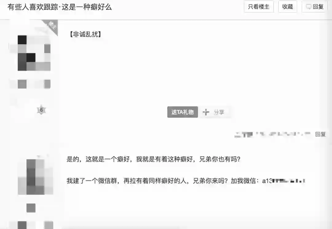 有时候还会分享自己跟踪的猎物,然后说一些跟踪的技巧,还有吓唬女孩的方法