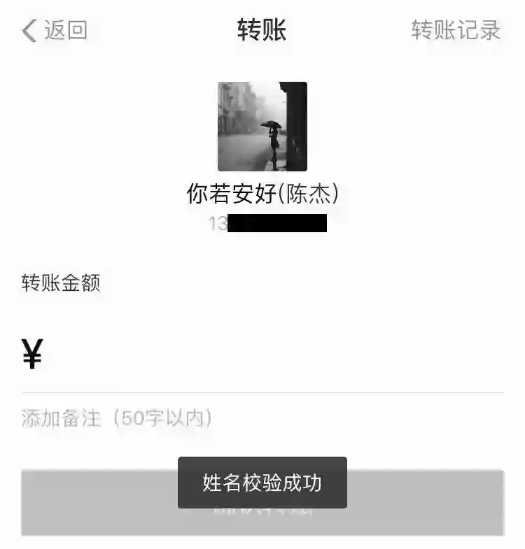 在支付宝搜索这个广东号段的手机,找到一个已经实名的帐号,只显示一个杰字,验证十几个常见的姓,最后核验成功。
