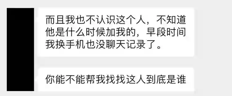 她说自己并不记得这人是什么时候有她微信好友的,早段时间刚换了手机,聊天记录都没有了,对这人也没印象,想拜托我找到这人是谁。
