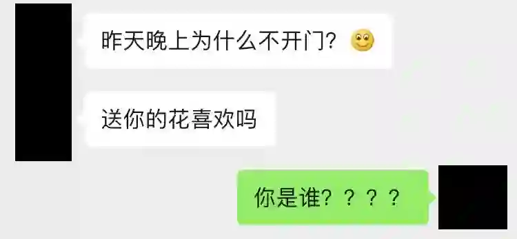 直到天亮小菲才敢出门,开门发现门上的猫眼被人用纸贴着了,门上还用胶带粘着一支玫瑰花,到中午的时候有人在微信给她发了条信息:“问她昨天晚上为什么不开门,喜欢这花吗?”