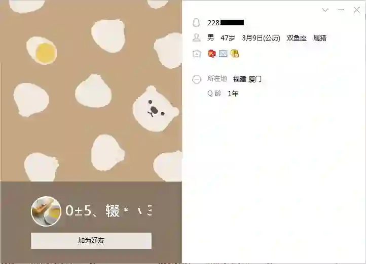 搜索这段数字的确是QQ号码,Q龄只有一年,我觉得是为了吓唬女生特意去买的帐号。