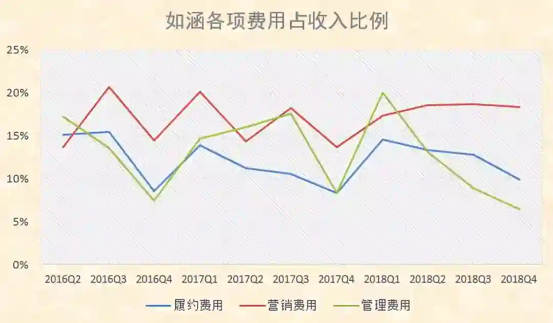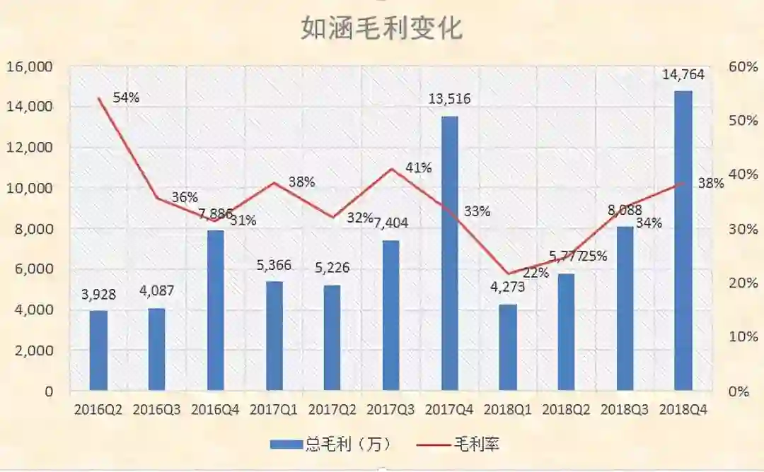 从2017年Q2开始,如涵的季度营收同比增速整体持续下滑,从2017年Q2的125%,降至2018年Q4的-6%。这是过去连续七个季度,如涵首次出现营收同比负增长。