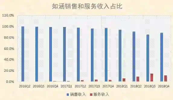 2017财年(截至2017年3月31日的前12个月),服务收入在如涵营收中占比0.9%,2018财年扩大至3.7%,在2018自然年的前三个季度,如涵将服务收入的占比扩大至11.7%。但相比直营的销售收入,依然很少。